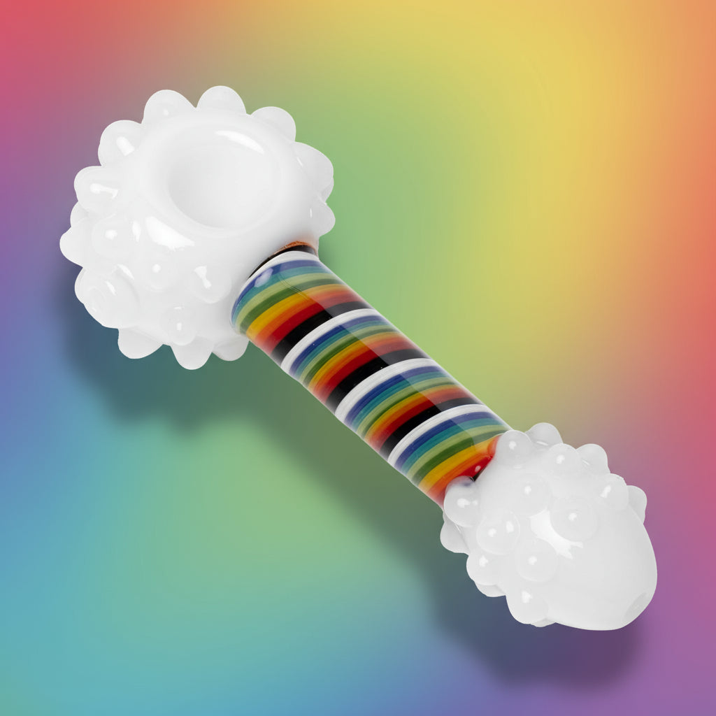 Add a vibrant splash with the Rainbow Spoon Pipe, a durable and eye-catching piece designed for smooth functionality and lasting style. Handmade from high-quality borosilicate glass, this 4.5" spoon pipe features a bright rainbow swirl stem and glossy white, textured ends for a comfortable grip and extra flair.