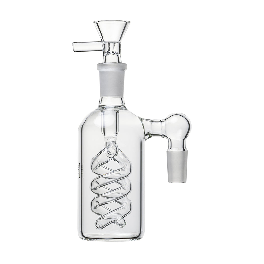 The 14mm The Spiral Perc Ash Catcher 45° or 90° is a clear, durable glass water pipe attachment with a spiral perc inside and three joints: top bowl, side bent joint, and bottom straight joint.